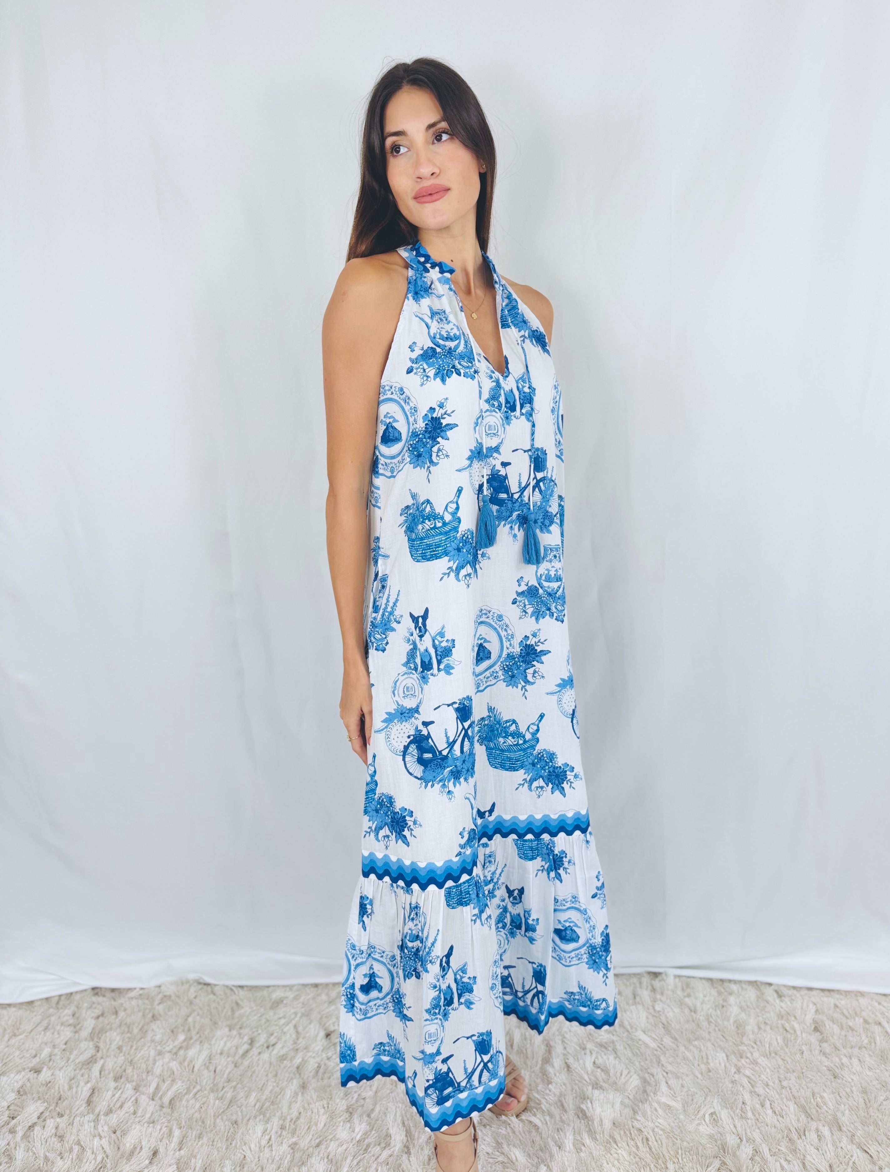The Fiji maxi is a very stylish silhouette with halter sleeves and a beautiful neck trim. We love the neck tie with tassels, and the easy flattering maxi body.