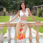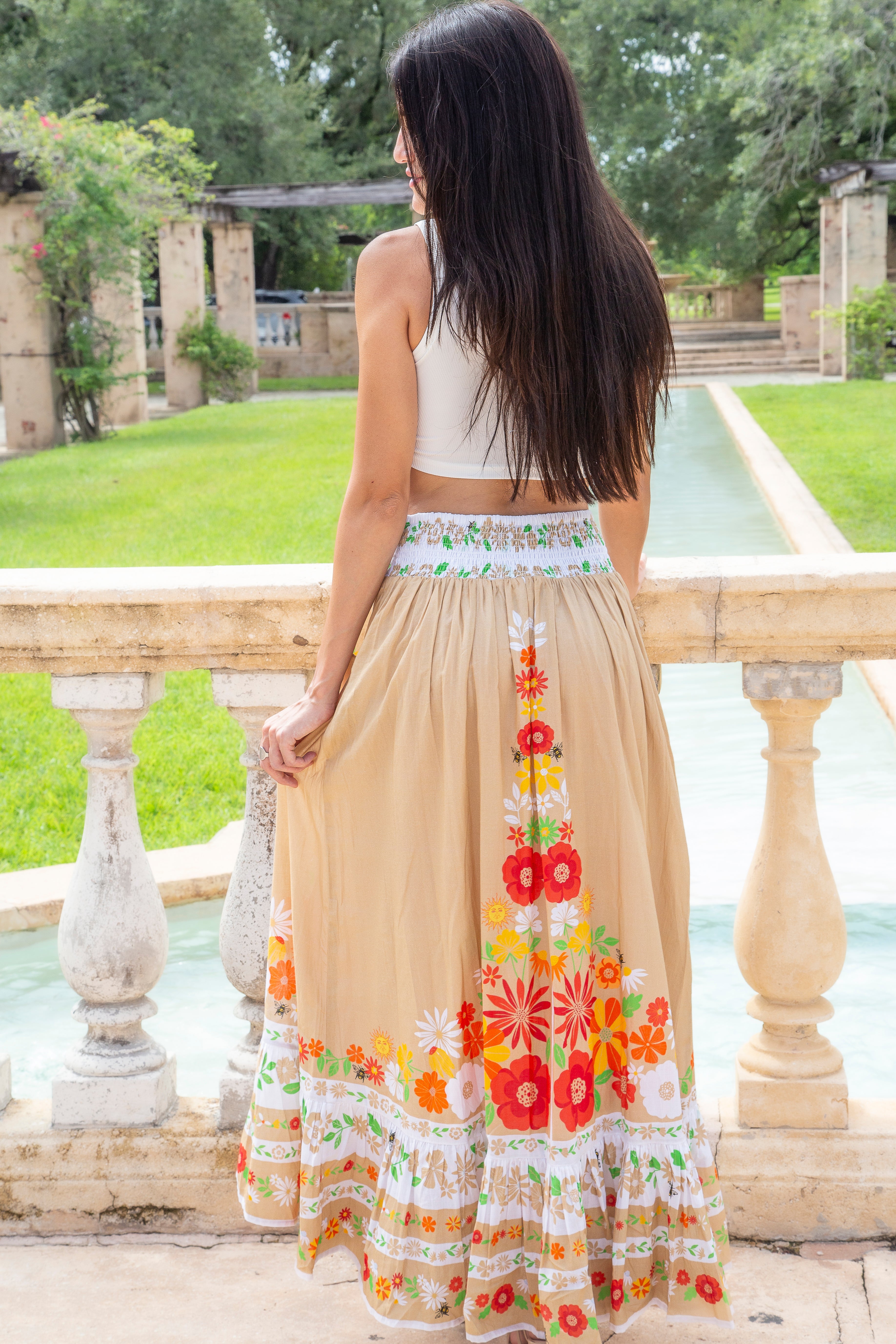 The Austin is a stylish A-line skirt with a high-low ruffled tier at the bottom. We love the elastic on the back waist band that gives a perfect fit. It has a button on the side with a side-zip. And yes, it has pockets!