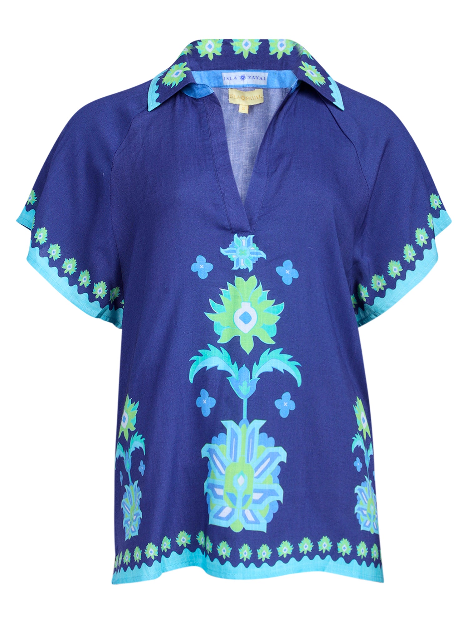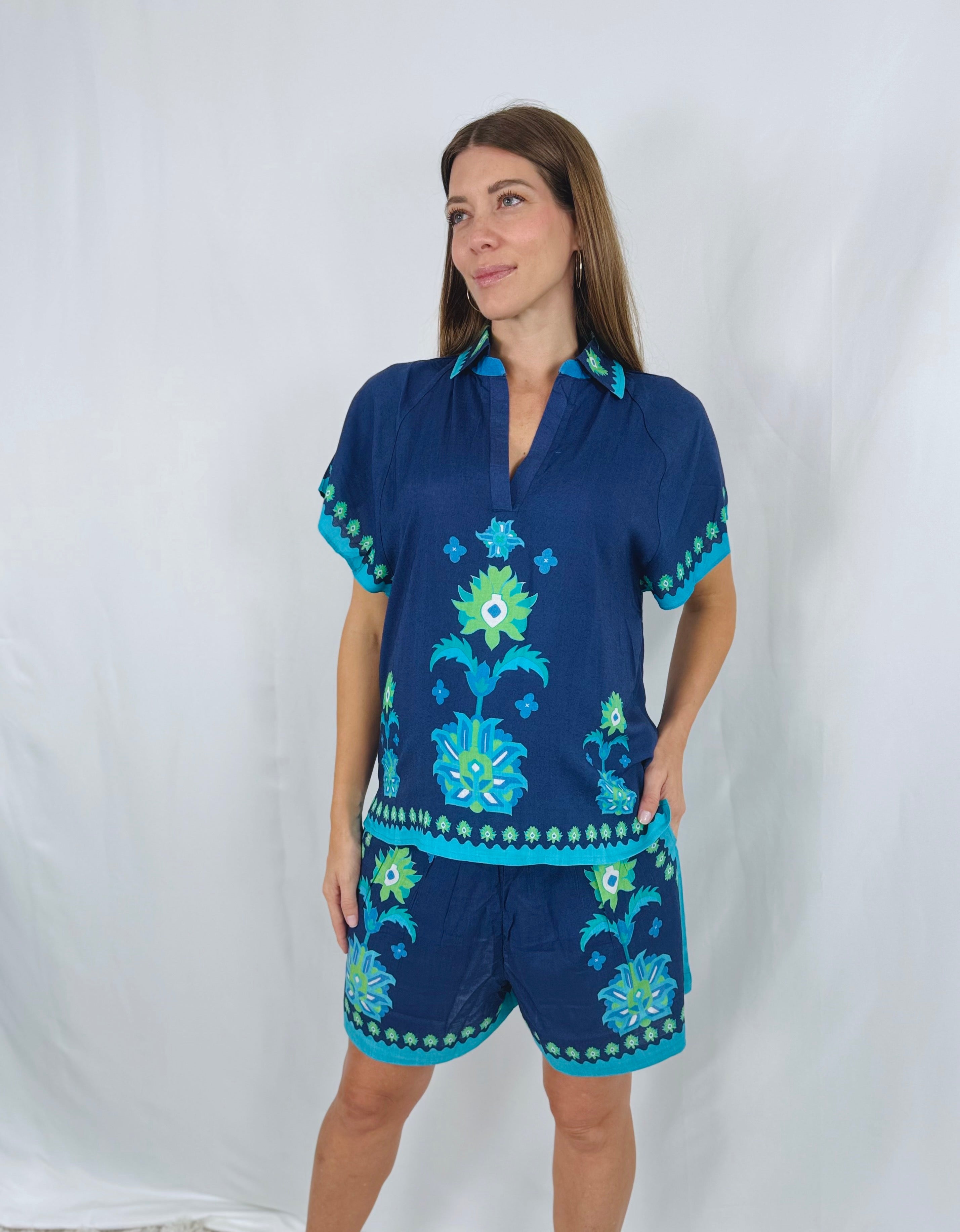 The Verona is an easy popover shirt that flatters all body types. It has raglan half-sleeves with a stunning placement print. We love the comfort fit.