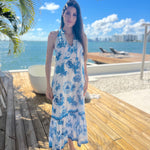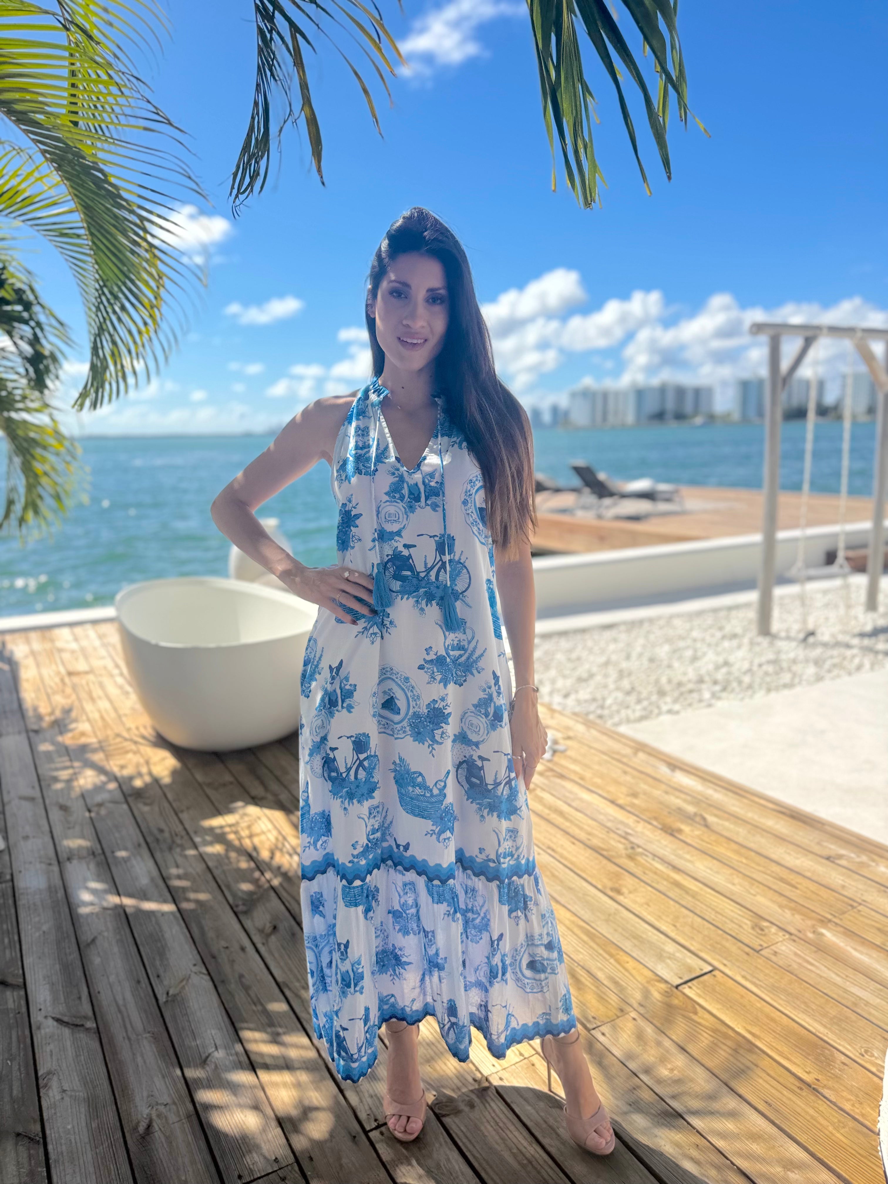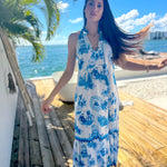 The Fiji maxi is a very stylish silhouette with halter sleeves and a beautiful neck trim. We love the neck tie with tassels, and the easy flattering maxi body.