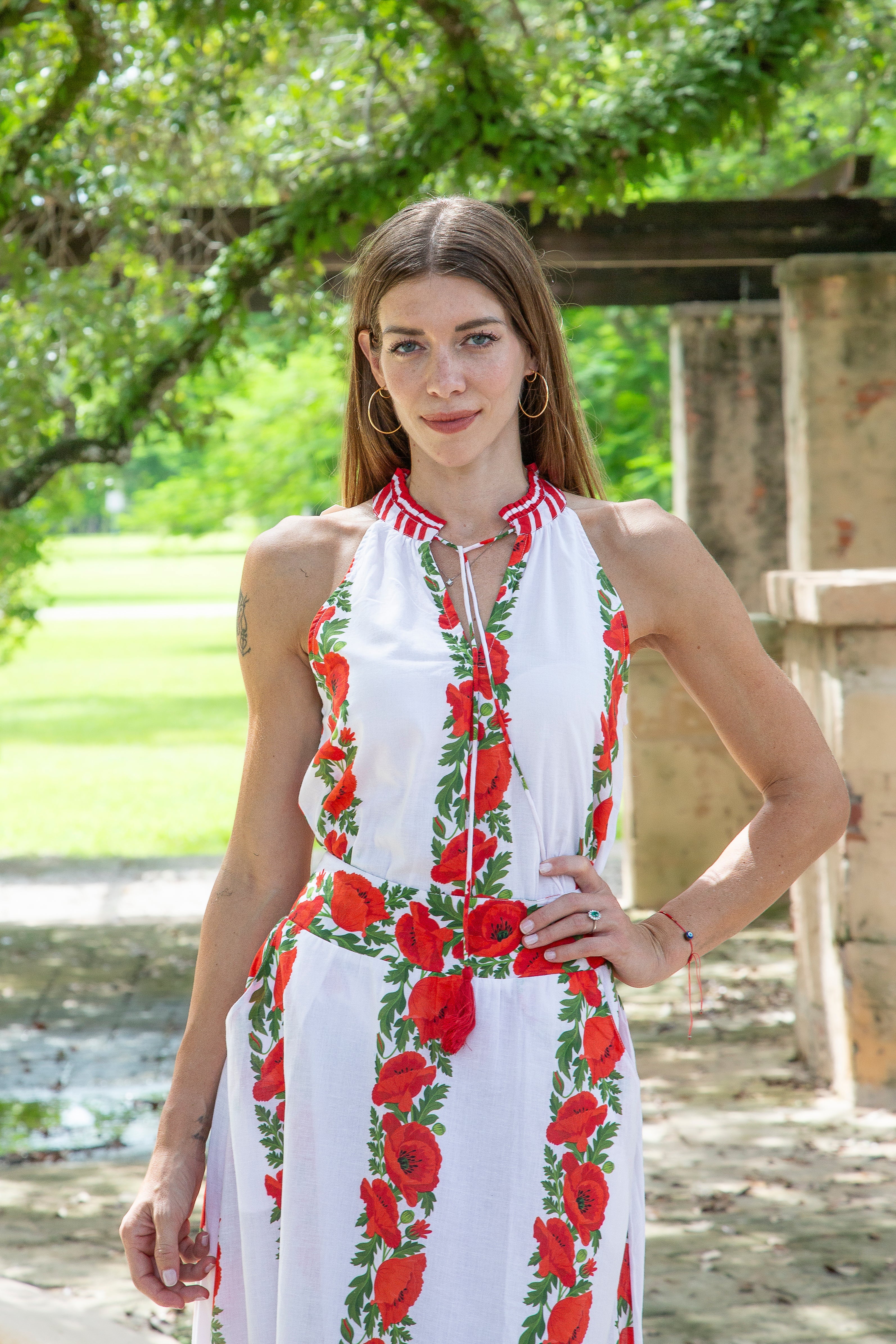 The Fiji top is a very stylish silhouette with halter sleeves and a beautiful neck trim. We love the neck tie with tassels. It pairs beautifully with a skirt, denim shorts or white pants.